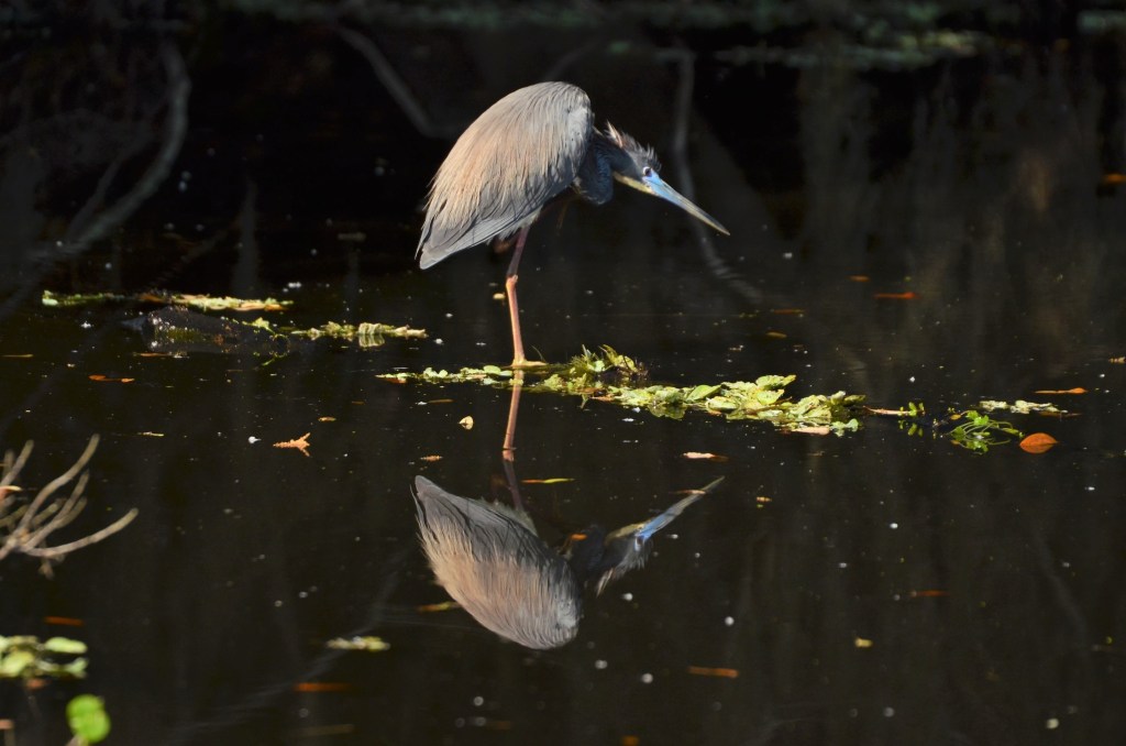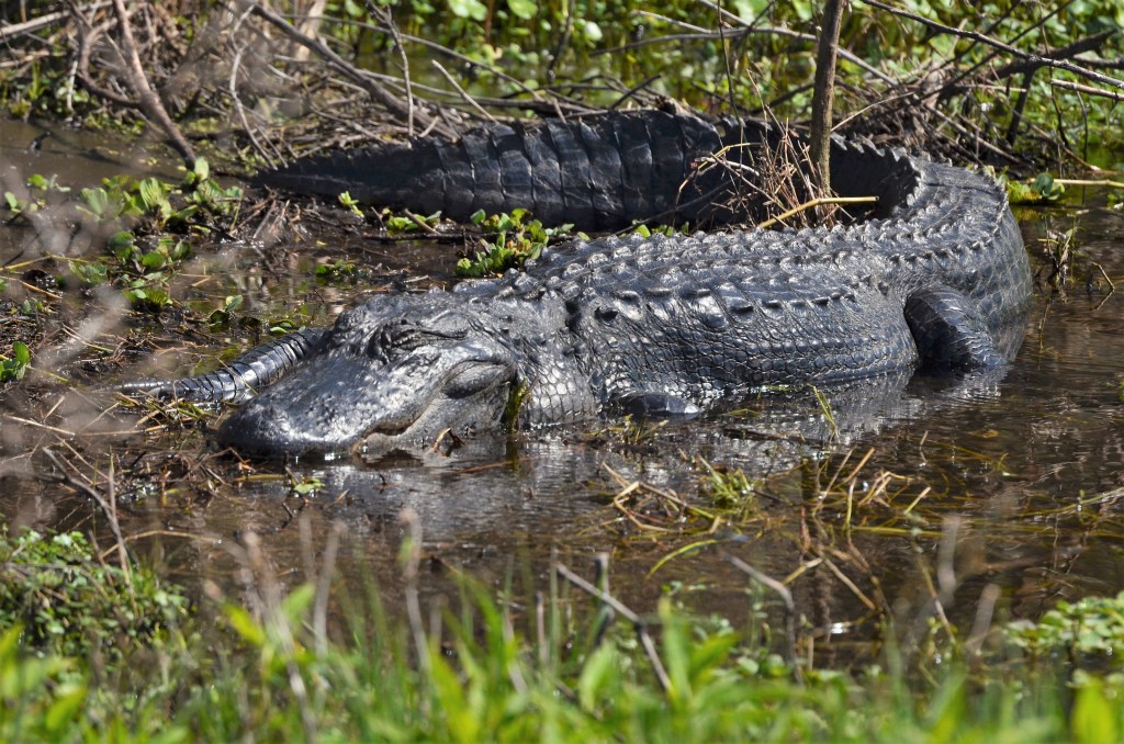 I head out again, into the world of grackles, limpkins and gallinules, none of which I’ve seen or heard of before. It pays to pause, because much of nature is stagnant and there’s a lot of it to see for the patient eye. When I reach the end of a shady lane I turn back, not wishing to swelter anymore and when I get back to the intersection someone sends me right to where they just saw a ‘gator. I move 50 metres up and get a shot of its upper bits then turn around and head back and, bingo, there it is, the biggie I’d missed earlier and had just walked past without seeing. They’re not frightening like estuarine (salty) crocs, but a little more ominous than Johnson River crocs and they have a presence in this place where dog eats dog and gator eats gator (and dog). There’s a famous pic on google search of a big one chomping on a medium sized one of his brethren at this very location. I’m not scared, but I wouldn’t want to upset him either!