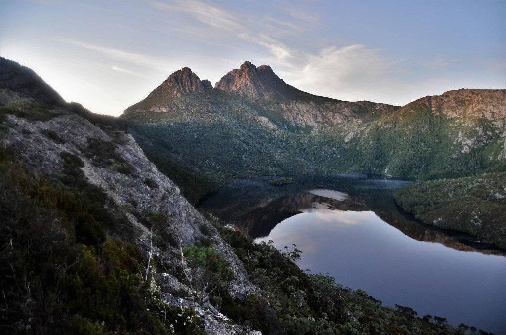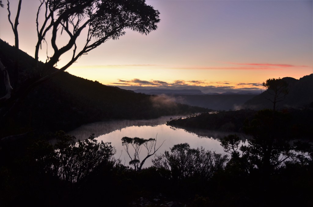 First light is appearing in the sky as the stars are banished for another day and there’s the tiniest wisp of cirrus forming up over Cradle. I reach the point where Lorraine and I had lunch only a few days earlier and have to make a decision; continue on Rodway or drop onto the category 4 Lake Hanson Trail. Though I know the former will get me to Twisted Lakes sooner, I’m torn by the fact that maybe there’ll be a photo opportunity at Lake Hanson and knowing there are chain sections on Mount Hanson so I head down and soon after discover why it’s rated a 4. It’s rugged and bum slides have to be undertaken here and there just to get down. It’s certainly not a place for the average stroller.