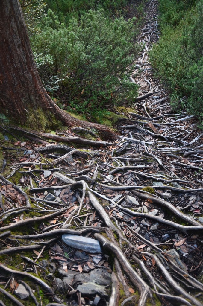 Constantly on the lookout for angles and interesting bits of nature, it’s not very fruitful until I come to a part of the trail that is tree roots and nothing else for about 40 metres before reaching a couple of ponds just above the lake itself. Here, the still waters and skeletons of trees long since dead lend an artistic atmosphere to the journey and I add some time to get a dozen snaps.