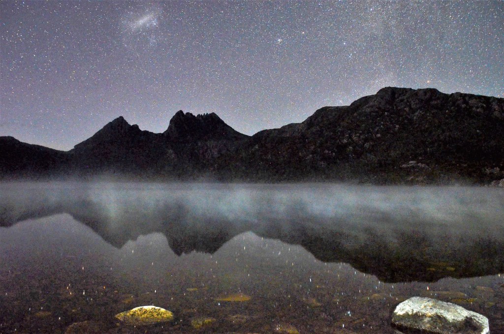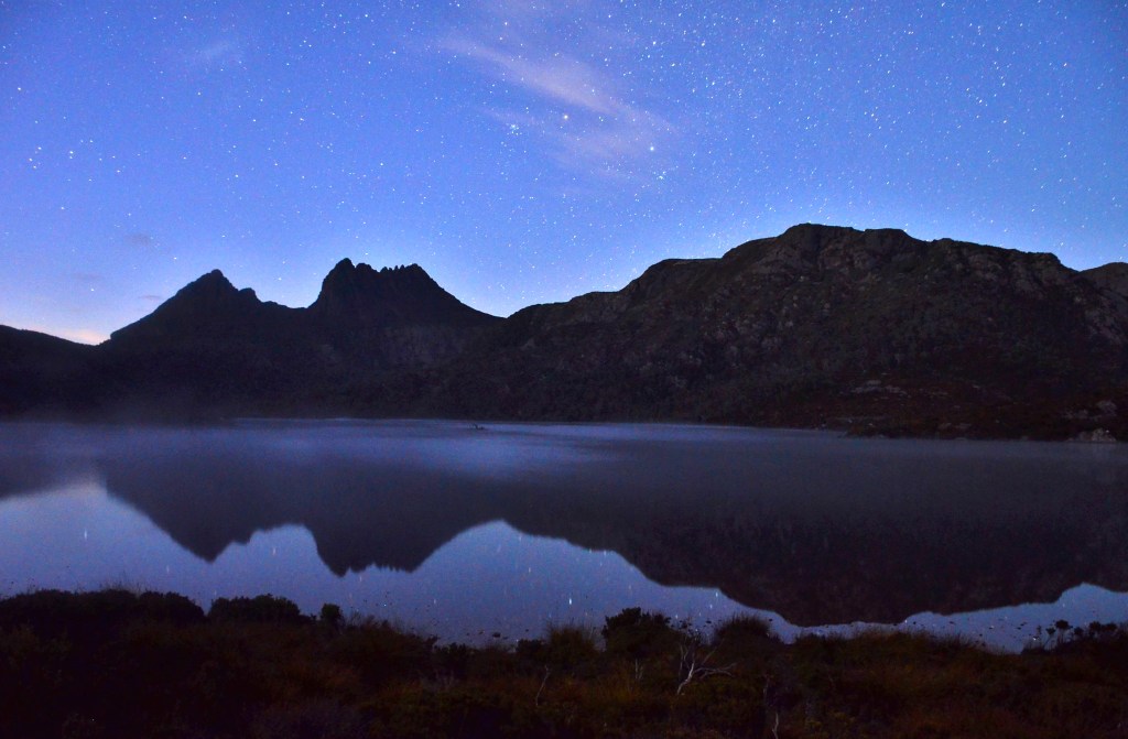 I’d hoped for millpond conditions so I could get the stars reflecting in the surface but there’s a surreal mist clinging to the surface of the lake, its ephemeral nature will become apparent when the sun bursts through. Meanwhile, I’m stretching out my tripod, getting the settings right on my camera (not as easy as it sounds) and praying conditions stay the same. The shots start clicking off, 30 second exposures of the Magellenic Clouds hovering over Cradle Mountain and then the artistic side of my brain starts running amok. “Where can you get a better angle?” it keeps harping; so I find myself moving hither and thither around the northern end of the lake, at times stepping in the muddy foreshore. I play the light of my head torch onto the foreground to try and add some depth, maybe pick out the fog or highlight some reeds. It’s like working to a deadline governed by the sun.