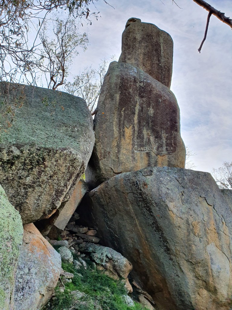 Weaving around I reached a significant vertical slab I’d seen from the road and stepped my way around to the other side, only to see some wit had written “Smile, you’re on candid camera”.