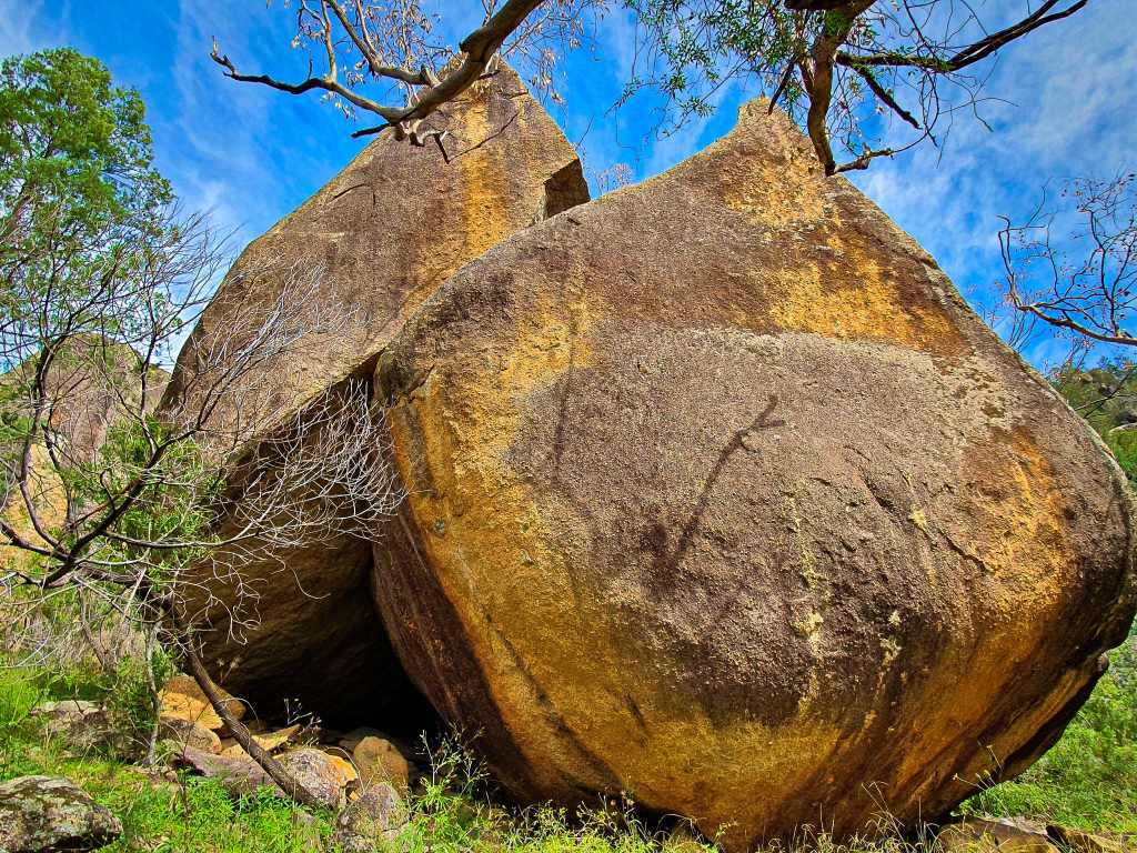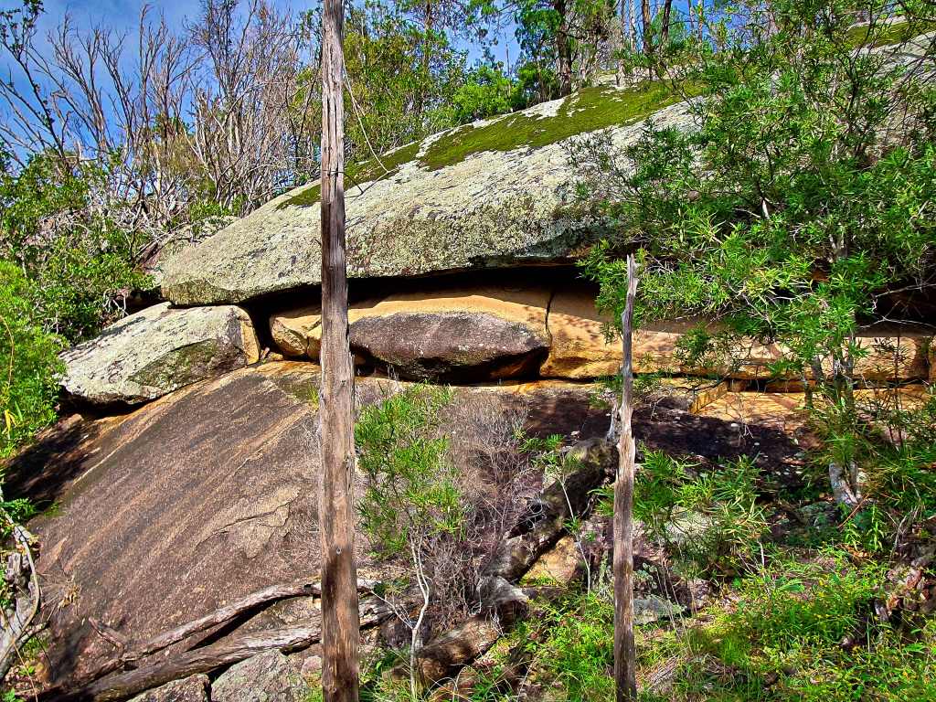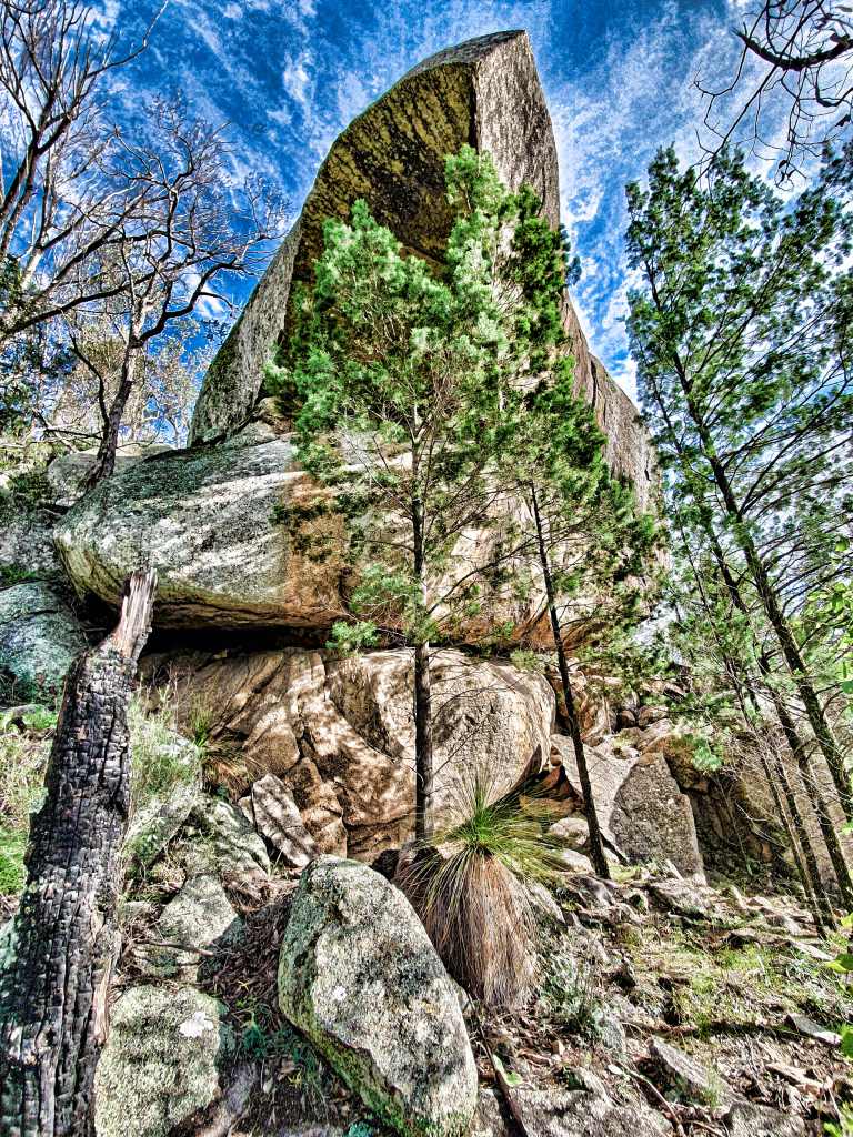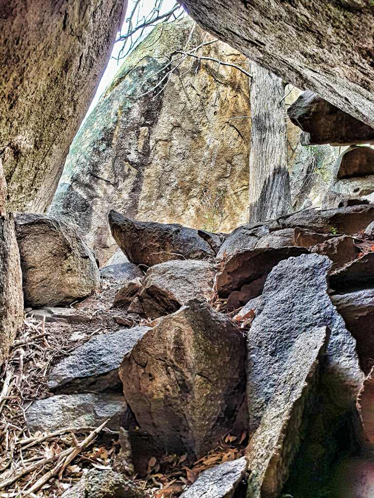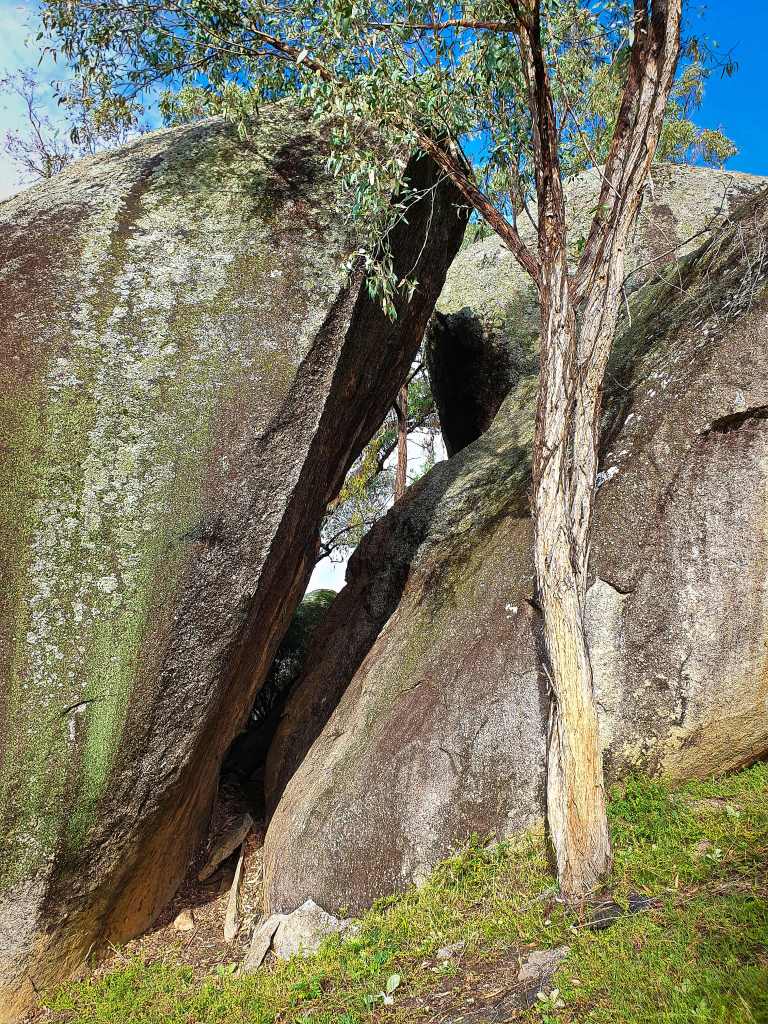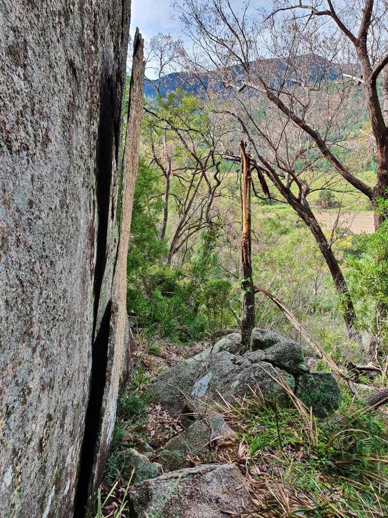 Monoliths shattered in half over the aeons, threatening overhangs weighing hundreds of tonnes, rounded monsters lording over the tree line and, here and there, mysterious cracks between giants, some of which you could make your way through. There were also a few grass trees that had not fared well during the recent dry times.