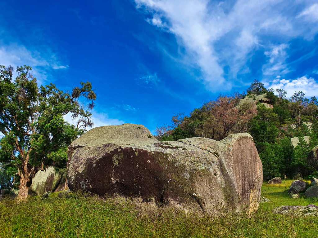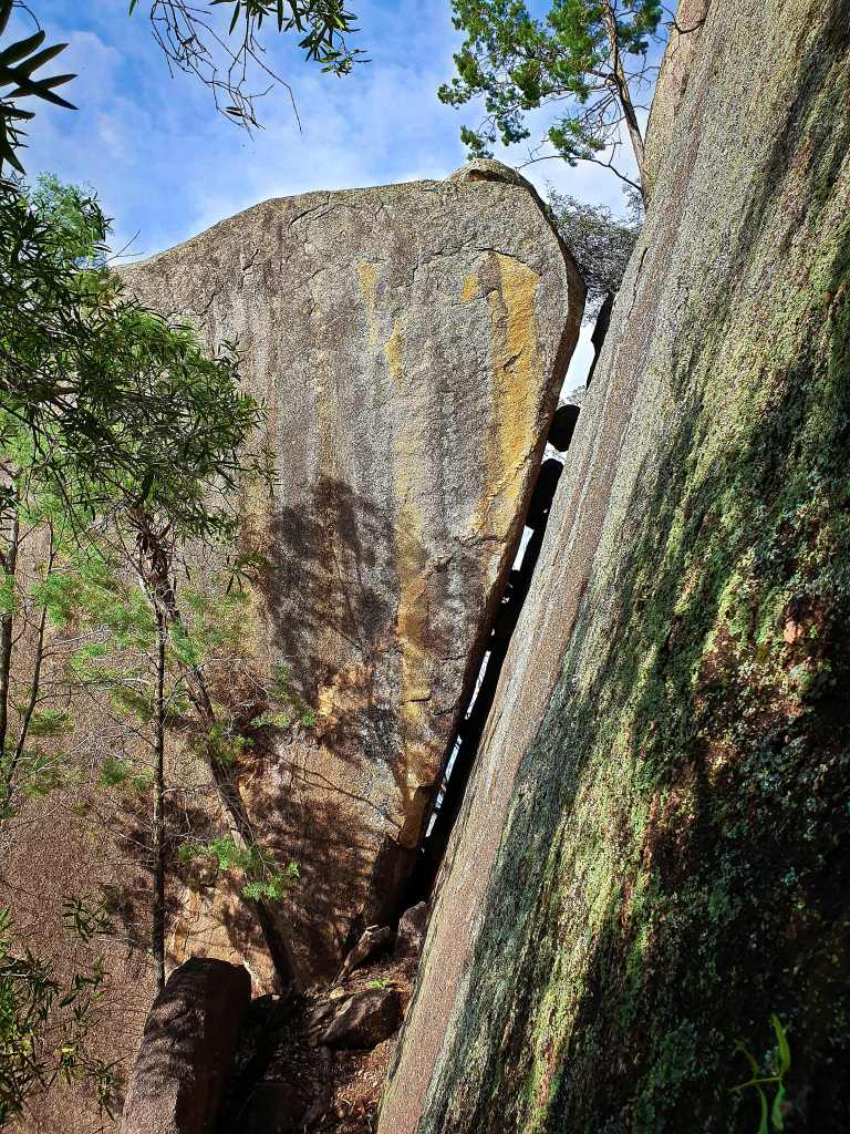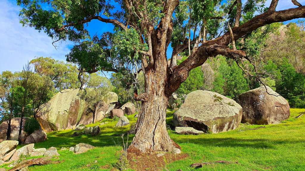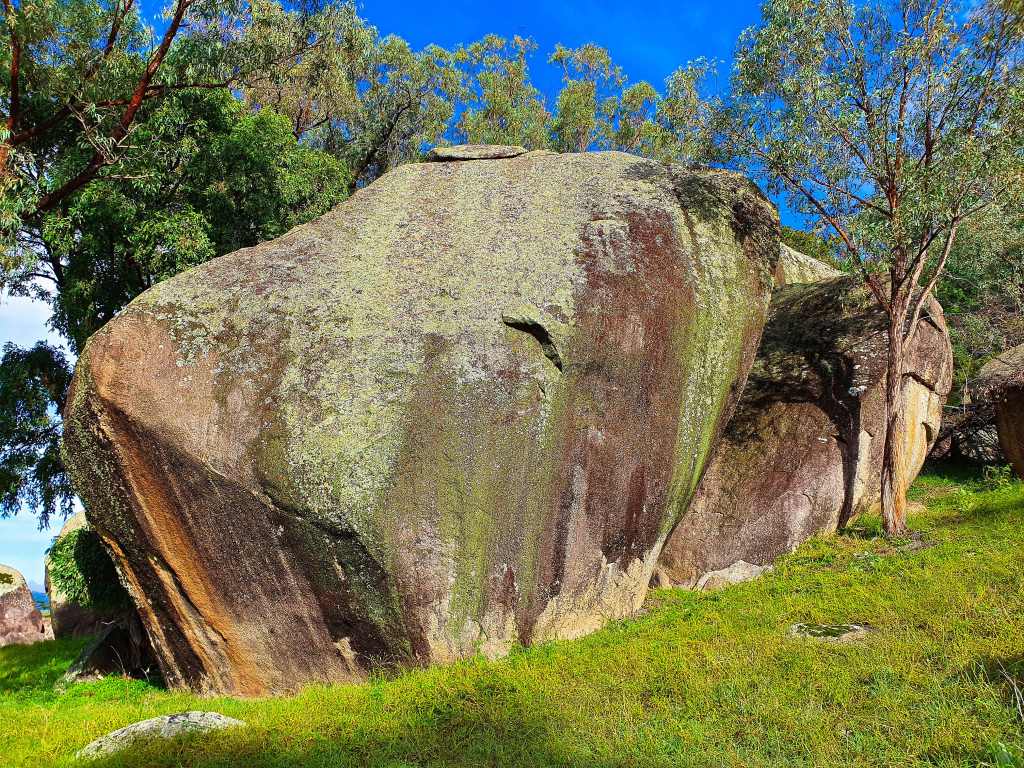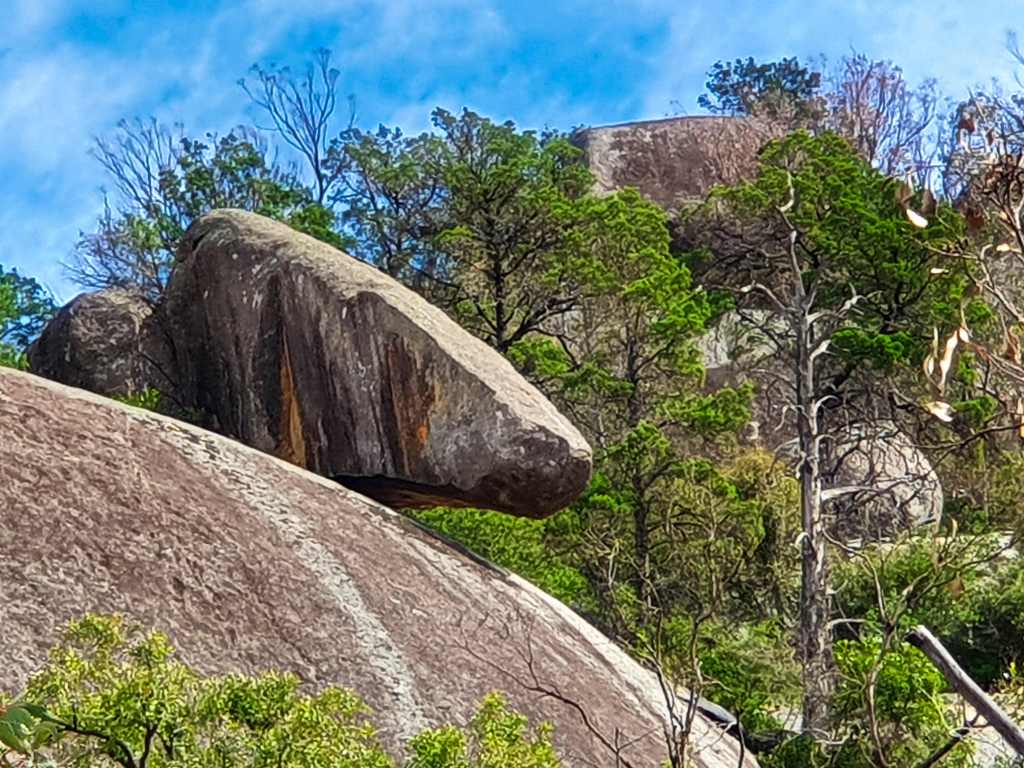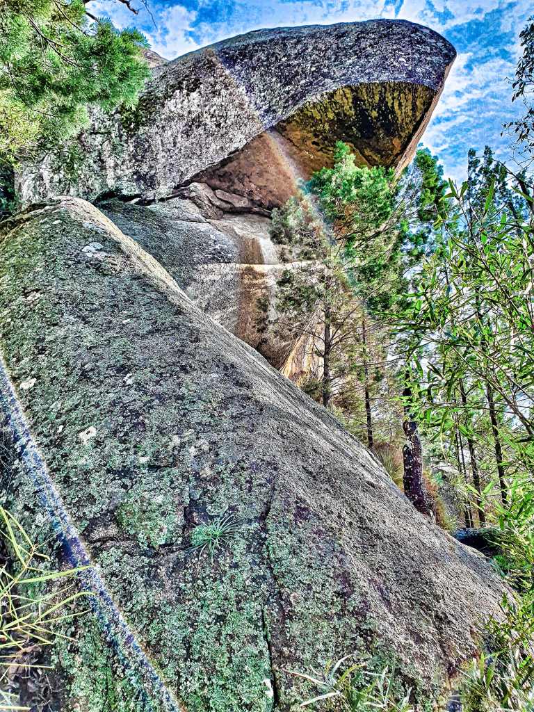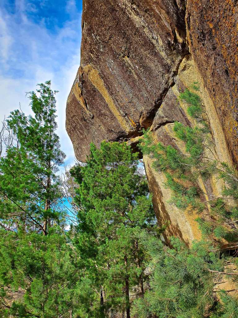 Monoliths shattered in half over the aeons, threatening overhangs weighing hundreds of tonnes, rounded monsters lording over the tree line and, here and there, mysterious cracks between giants, some of which you could make your way through. There were also a few grass trees that had not fared well during the recent dry times.
