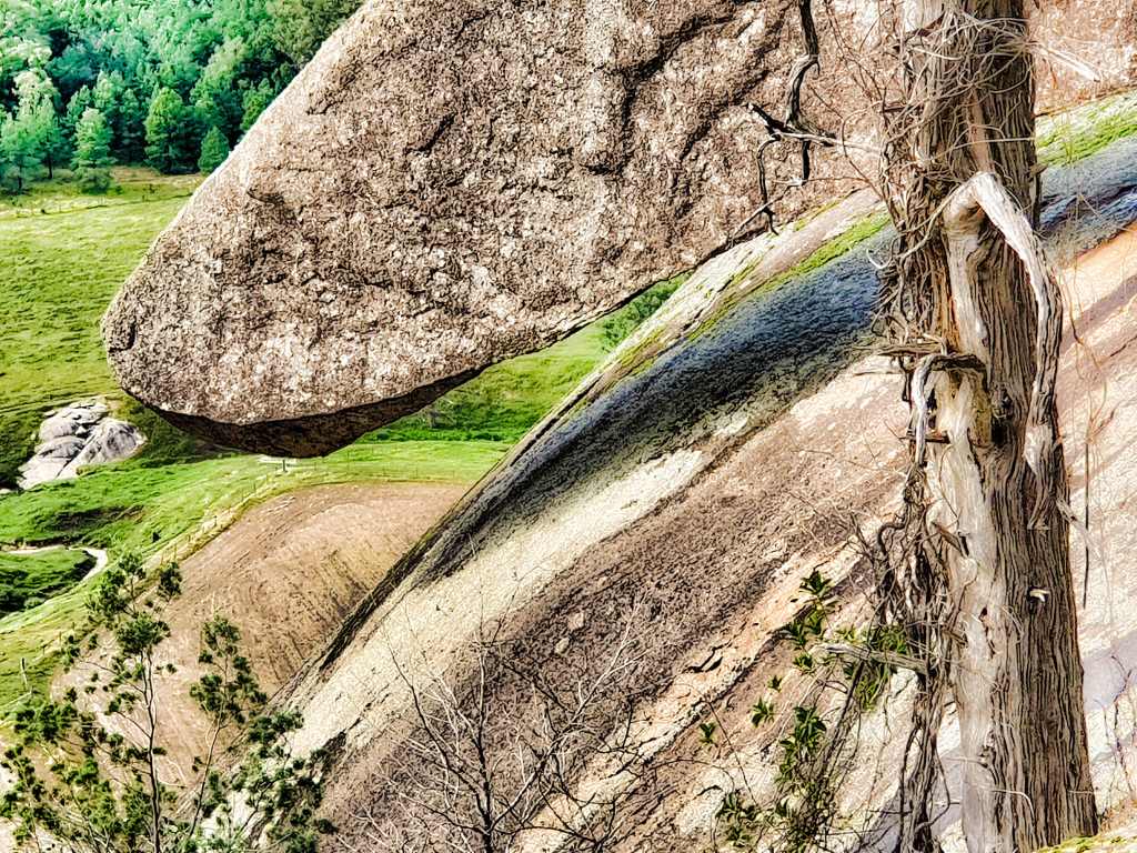 Next up was a pair of rocks that looked like the heads of Snugglepot and Cuddlepie, replete with pointy heads and a tree shadow for enhancement. Occasionally roots had penetrated the cracks, seeking the water from runoff no doubt. Another significant boulder had a large sliver coming off one side. Though that in itself is not unusual, the fact that mosquito – like insects were loving the inside of the crack I found fascinating.