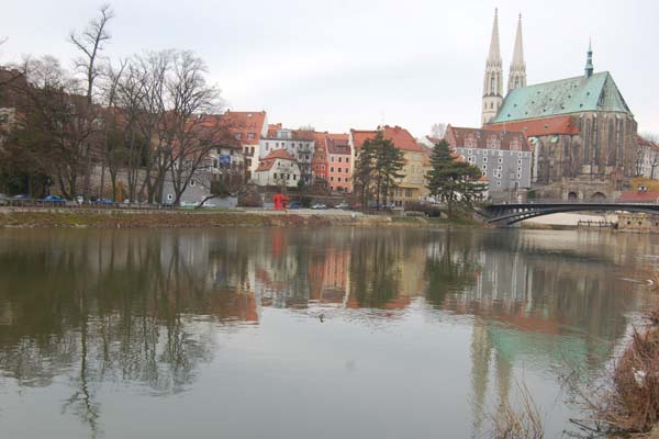 At night it looked so different. A series of lights along the waterfront with some barely discernable buildings behind. I had no idea what it was called or what was there. The Goerlitz map showed just a few buildings beside the river and the “living house of J. Bohme”, whoever he was. I left my digs and knew where I wanted to go but there was a railroad track in the way. I figured I’d just walk across the tracks but a very fast train was coming and I just managed to leap into the grass on the other side before the train came through. I’m glad a certain person wasn’t with me at the time.