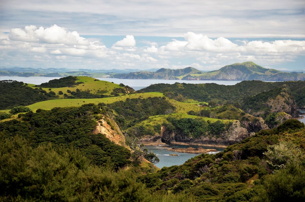 Somehow it just didn’t seem right but the trail headed uphill, as I’d been told it would, so we must be going in the right direction. At the next intersection we took a 5 minute diversion to a lookout over a bay. While it was nice, nothing prepared us for the 360 degree panorama when we reached the top of the hill. The vastness of the Bay of Islands was apparent from here and our cameras happily clicked away. Then we referred to the map again. I saw people back from where’d come earlier and they were taking an intersection we hadn’t noticed. Immediately it was clear that we’d come the wrong way again but now, having our bearings, it suddenly became obvious. All the trails on the map fell into place.
