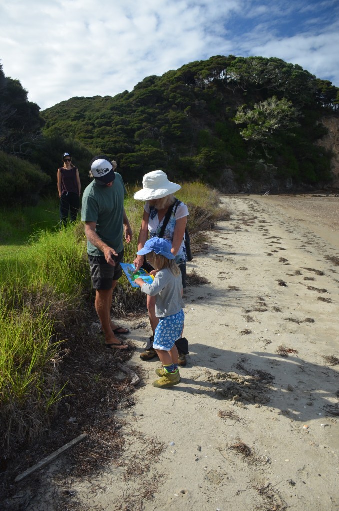The long descent would up at a beach and, referring to the map, we figured we’d gone the wrong way yet again. Lorraine no happy. Actually, I was disappointed as well. We met a family coming the opposite way along the beach and complained about the maps to them. We’d worked out that we were at Paradise Bay, some distance from where we’d hoped to be and we’d just added about an hour to our journey. The family indicated there was a sign not that far ahead and that would hopefully set us right.