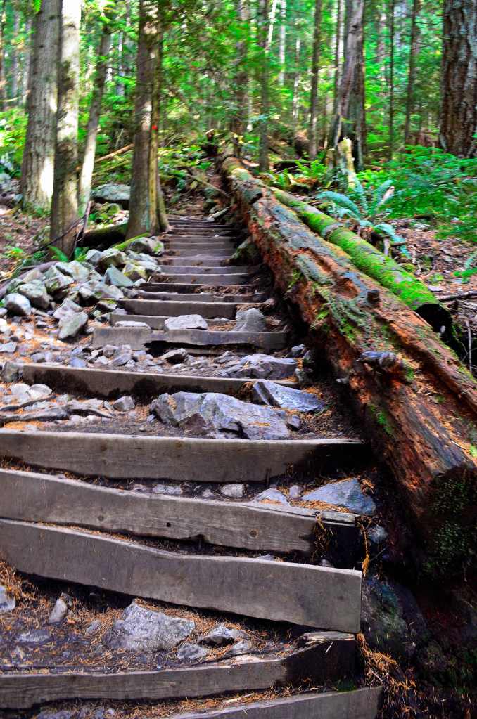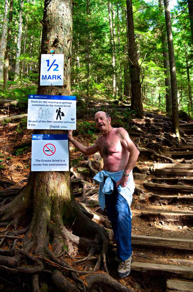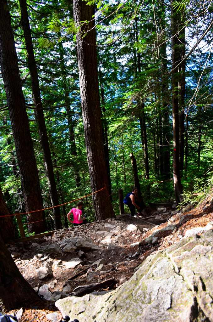 I pointed pleadingly outside to the glorious sunshine and almost cloudless sky.  Surely the birds and the bees would be loving it?  Apparently not, so I’d come around to the cable car option but, after the price had been uttered, plan B emerged.  I’d heard of the Grouse Grind and, my mind kept saying, “You can do it” and so I asked the girl, who was from Sydney, and she sympathetically replied that it would take 1-1 ½ hours (insert wince where appropriate).  I then budgeted for 2 ½ and set off.