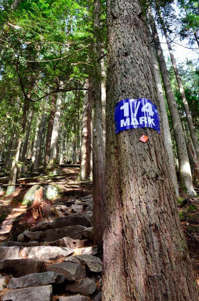 Around 16 of 40 the ¼ WAY sign loomed up. 5 different groups had passed me earlier, now it was my turn.  Moving slowly and methodically carrying all my unwanted camera gear, I kept up a pace I had taught myself in the German Alps.  Slowly enough so you don’t have to stop so much and your body can keep up with your mind.