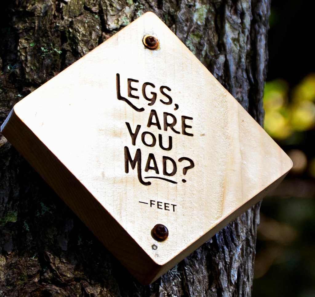 You may twist and turn on this trail but, believe me, there is only one direction that you’ll ever remember, and that direction is UP.  There are little markers, 1 of 40, then 2 of 40 etc., and they, as best as I can figure, are vertical indicators.  In addition, there are humorous boards that someone with a lovely sense of the absurd has posted.  There was one more sign, it read “Living in the moment could be the meaning of life”.  I would have cause to reflect on that later.  Another said, “We’re smiling right now – Lungs”.