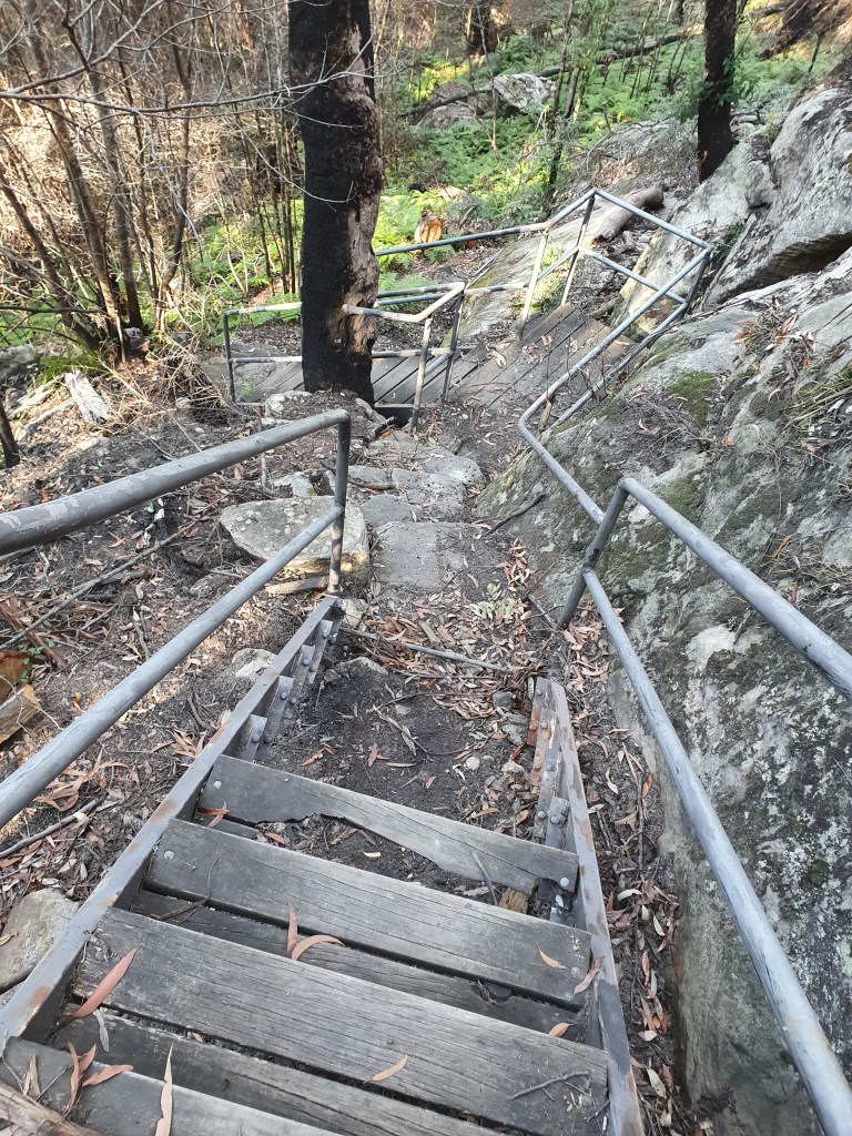 Down the rutted and rocky trail I went.  It’s only 500 metres but, halfway down, there’s a set of stairs, with the third lot of warnings and barriers I’d come across.  It was here that some damage was evident, with 4 ½ steps missing from a made wooden staircase.
