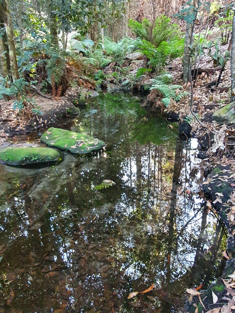 I scrambled down, the sound of water gurgling on sandstone as a magnet.  Through the ferns I strolled, shrouded by the tranquility of the bush, until I reached the point where the stream disappeared over the edge.  There are times when I’ll try to get closer to get a shot, today wasn’t one of them.