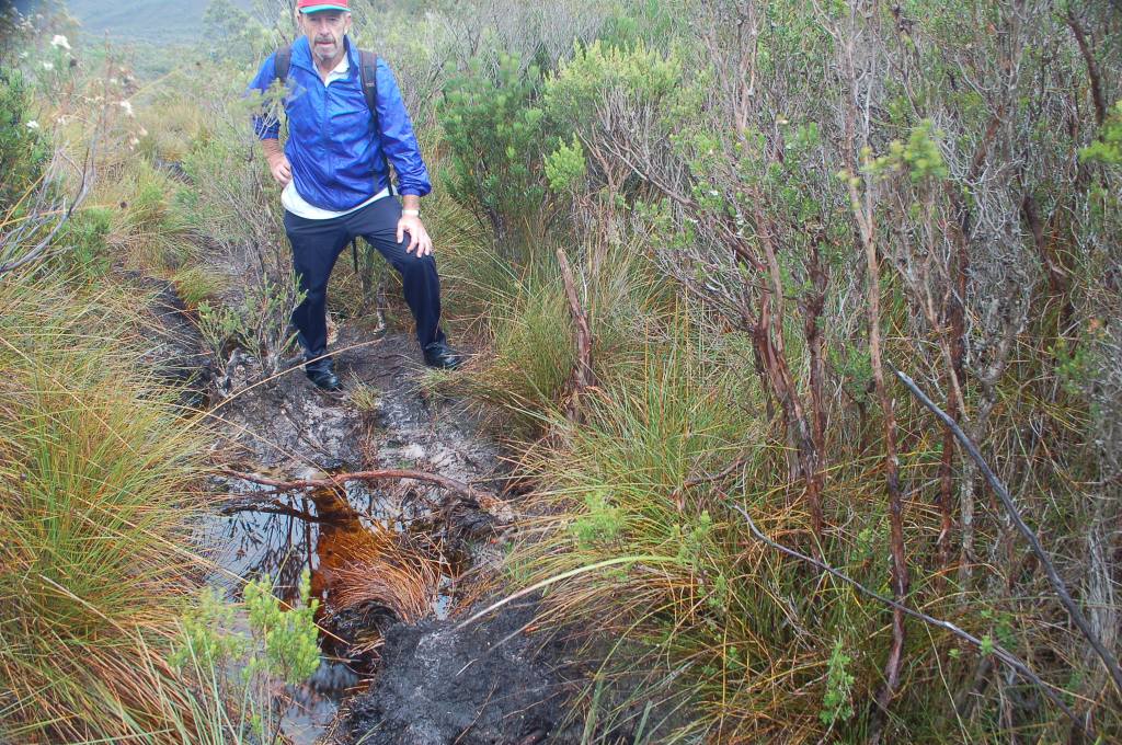 But Lake Judd lured me as a fish to the bait. Its vista from a previous trek on high to Mount Eliza tormented my brain. I splashed on as the drizzle arrived. Then, at one point, I emerged from a forested section and determined that since the trail ahead was so bad and was only going to get worse I should quit; thus I turned around and went back into the woods, but struggled to find the path. Eventually I emerged and continued on. Lord the track was terrible but I suffered in silence.