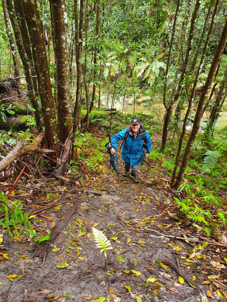 I headed back while Ian2 pushed on. Aways on the return trail I espied a safe way down. At least, by hanging onto some passing trees it was. There were small cascades I was keen to shoot and the results were pleasing so I continued further up the stream, recording photogenic spots and splashing through the water with gay abandon in the gum boots. It’s definitely so much easier and they’re surprisingly comfortable.