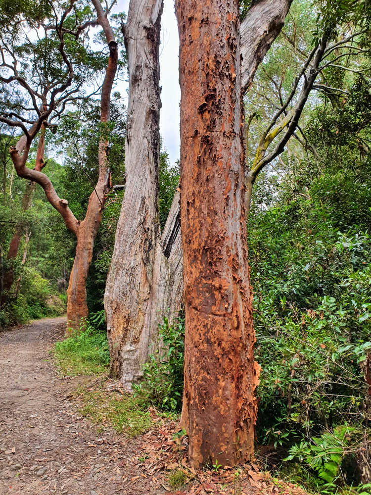 Scribbly gums and angophoras are the stand outs at trail’s side. Many of the older ones have been riven by lightning strikes where the current has found the internal moisture and followed it to the ground before exiting via an exposed root, wreaking havoc en route as the juices boiled, sometimes encasing the insects in resin. Where branches have broken off, leaving knots, the ensuing flames reach for oxygen, cooking any birdlife nesting places.