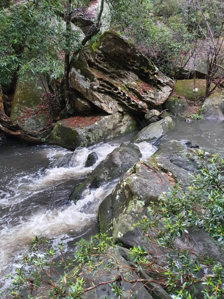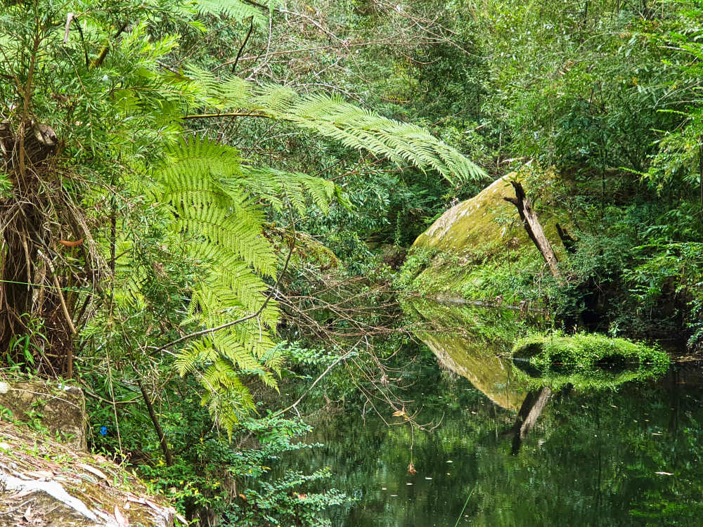 Though it’s barely fit to be called a creek, Devlin’s has some delightful waterholes that reflect the forest and some of the bizarre rock shapes on their banks. At the first ford I come to you can see some potential downstream but access appears impossible. I climb away and, from on high, it’s apparent there’s opportunities galore down there but I can’t see a way down.