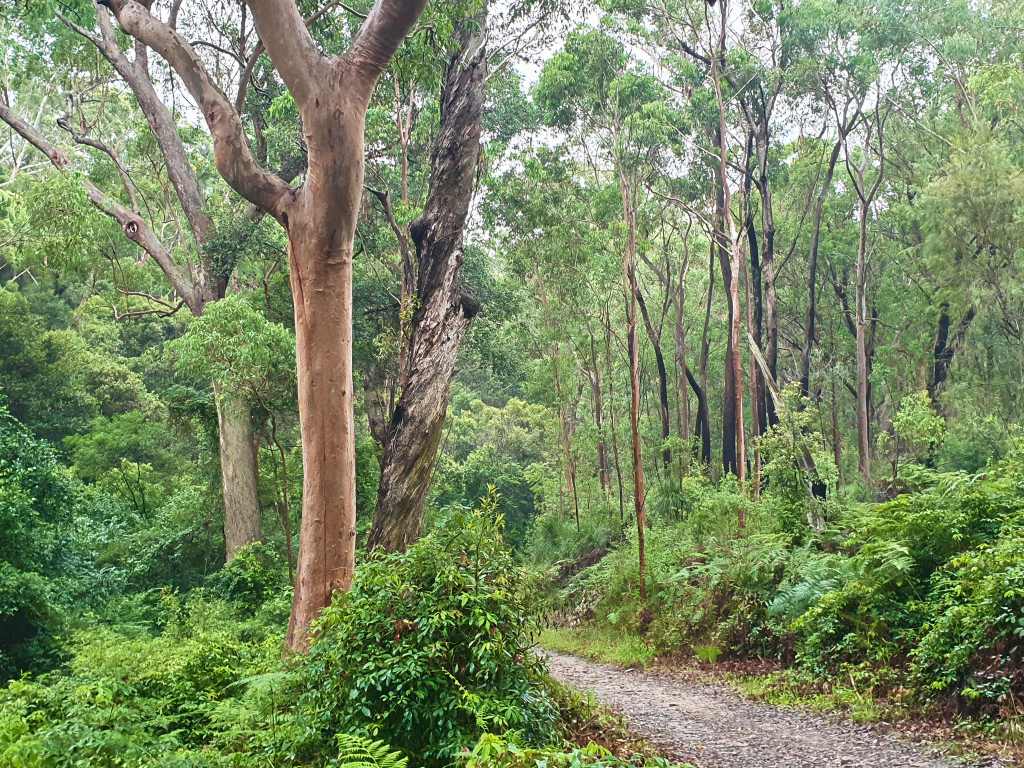 Picture taken, I enquire about the Browns Waterhole Trail, on the other side of the crossing, which takes you to Boundary Road. I ask because it should be visible from where we are and I can’t see it. She offers to show me the way as she’s heading back home up that very trail. When we reach the start it’s no wonder I couldn’t see it. The entrance is narrow and obscured by vegetation. Again, there’s no hope of riding so I have to lug the bike up, as the lady does with hers when she’s not walking. We converse and she says she comes from Wisconsin and is doing a Phys Ed university course at Macquarie Uni. Her name is Jane and I’m careful to refrain about any crass “Tarzan” retorts, especially when she insists on helping me carry the bike up steep steps. I feel uncomfortable when I accept but have to concede it’s a relief. We bid farewell at the top and I actually know my way home from the exit, having researched before I left.
