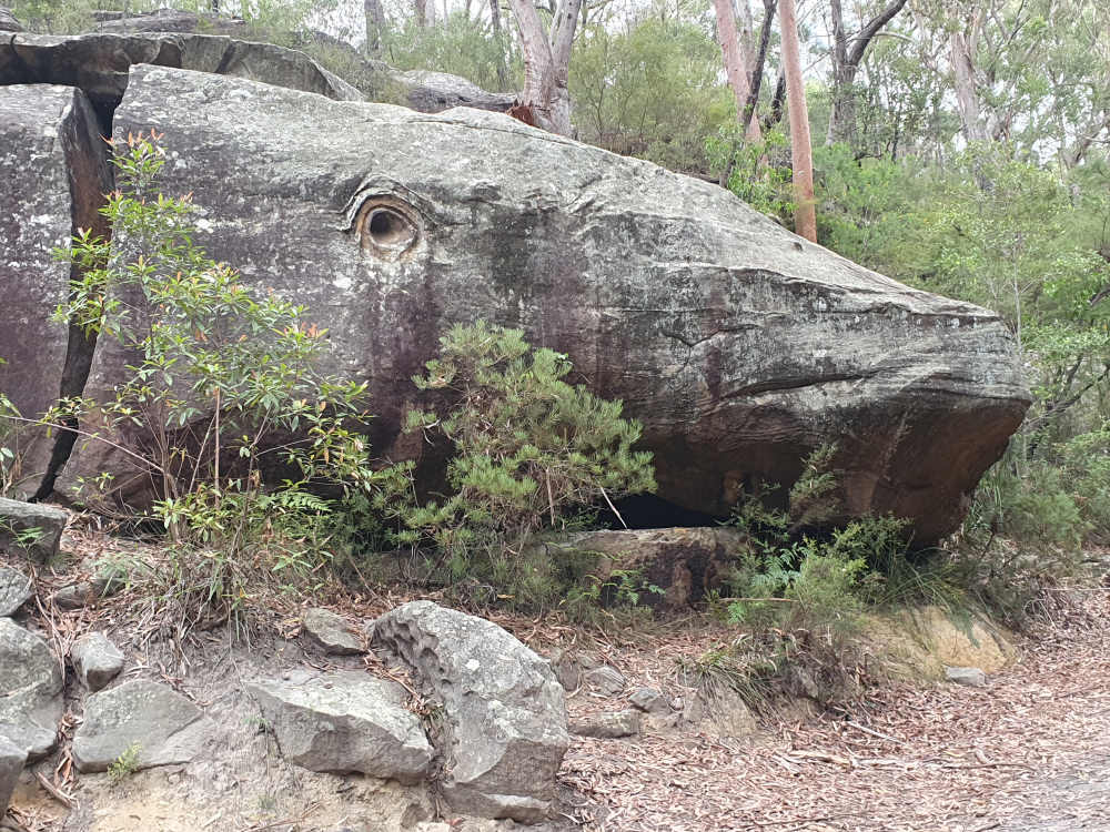 Eventually I stumble upon a rough track. It will lead me down to one of the main trails and, when I arrive, notice a map on the other side. It transpires that I was at one of the more famous landmarks, Whale Rock. I turned around and there it was, right beside where I came out. I’d walked straight past it. It’s quite extraordinary how the rare whorl formation that represents the eye is perfectly placed.