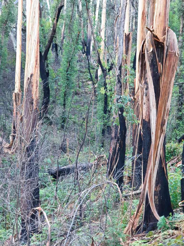 Down, and now the forest of ribbon gums takes over. You can’t help but look at the wonderful stand of Eucalyptus viminalis in various stages of bark shedding. In my experience it’s rare to see so many having the forest almost to themselves and their pristine creamy trunks are in stark contrast to the dull background, some of which is the blackened vegetation of bushfires, whose charcoal remnants still remain, but this is a land of harsh extremes and people speak of floods in these times and the fresh growth now tinges the forest green.