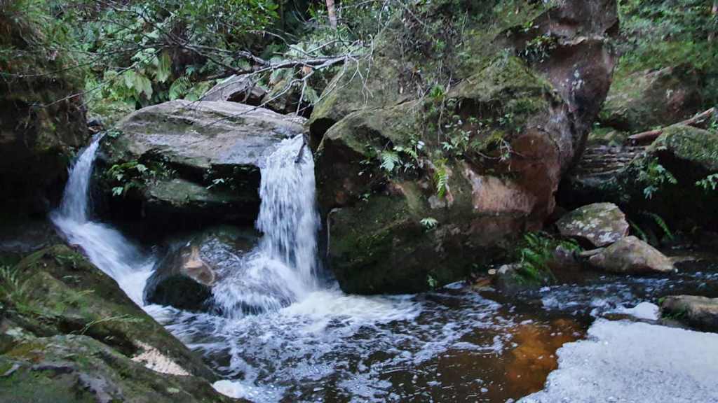 A fine stand of coachwood trees finds the environment to its liking, the gum trees having vanished a quarter of an hour ago. Deeper into the gloom I go, the two streams converge and the noise is more noticeable where the occasional cascade hastens its descent.