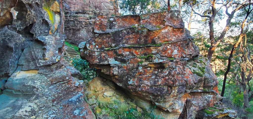 Thus it was that visions of such a place beckoned me to rise and move beyond the confines of comfort, the only decision being whether or not to take some warm clothing, even though I knew I’d get sweaty, but I took a jumper anyway. The door slammed behind me and I was surrounded by cool mountain air as I moved along the ridge, away from the popular lookouts to the descent, the first of many hundreds of steps now taking me past some huge sandstone outcrops that looked like a dinosaur had been eating them, so unruly were the patterns. They were coloured as well, rich lichen red being foremost on a background of black with occasional blotches of yellow.
