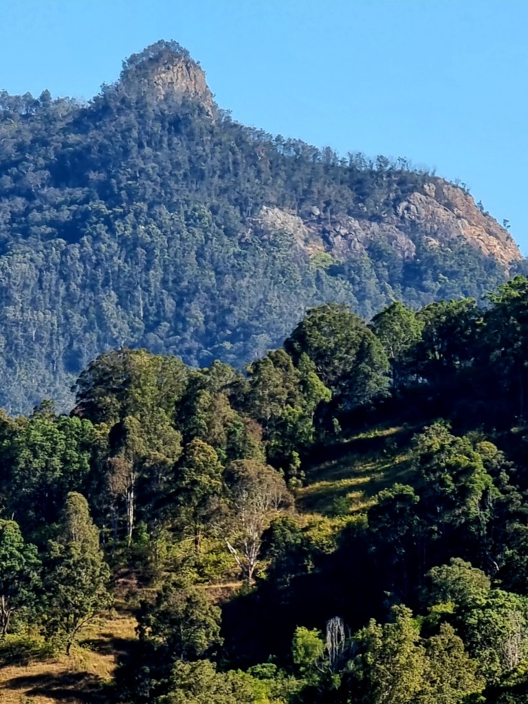 Ahead now a mount with stark rocky outcrop took my attention. Was my destination anywhere near that? Three kilometres later the turn-off and dirt road arrived almost simultaneously. Dingo Tops was where I was headed and also the name of the road. From here it was strictly uphill, winding first through farmland and then breaching the outskirts of the forest before twisting through a wonderland of native trees.