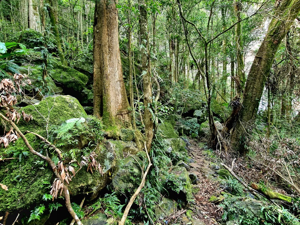 The upper slopes are gentle and, as I brush past a large turpentine, I’m grateful some of the giants have recovered though there’s one I have to negotiate, fortunately with steps cut into it, that has collapsed in the recent past, probably due to the persistent rain loosening the soil. The first time I ever walked here, a few decades ago, the memory that lingers was of a large area where the sun was able to come through and birds nest and jungle brake ferns were in such profusion, the like of which I’ve never seen before or since.