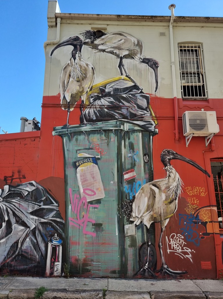 The goal was an obscure lane called Teggs at Chippendale this time. The ibis, aka rubbish renegades, trash turkey or smelly flamingos. Here they were splattered all over the side of a pub wall. Only problem I had was getting there. You see, that’s one of the things about street art, some are in obscure locations totally unsuited to vehicular traffic. That’s where the pushie comes in handy.
