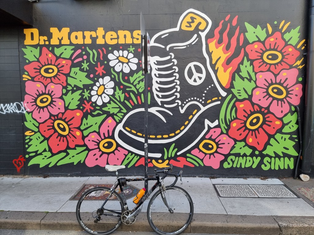 Teggs is a narrow way but the wall space is large and littered with Scott’s handiwork. It doesn’t disappoint. I cop a bonus with an employee cleaning the glass doorway then it’s time to head over Newtown way, sort of. Somehow I find myself in the outskirts of Redfern, then through Eveleigh, Marrickville and who knows where, riding through streets I had come to know just 12 months ago.