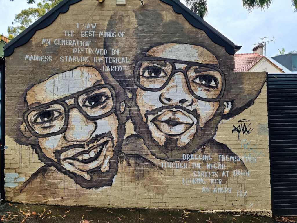 My favourites are the political ones, such as the painting of two blacks by Helen Proctor in Lennox Street with the script “I SAW THE BEST MINDS OF MY GENERATION DESTROYED BY MADNESS, STARVING HYSTERICAL NAKED, DRAGGING THEMSELVES THROUGH THE NEGRO STREETS AT DAWN LOOKING FOR AN ANGRY FIX”, an extract from the famous poem “Howl” written by the noted poet Allen Ginsberg, who vigorously opposed capitalism and conformity in the U.S.A.