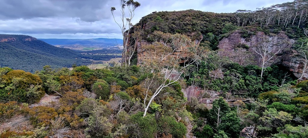 Today was windy, chilly and overcast, the latter making it better for photography; with even light making for less contrast. Initially there’s not much to see, but you soon come to Lamberts Lookout. Here I appreciated the fact I’d brought both a jumper and a parka, not to mention a beanie, as we gazed out beyond a nearby sandstone cliff across to Kanimbla Valley and got blasted by the wind. It’s just a warm-up, pardon the pun.