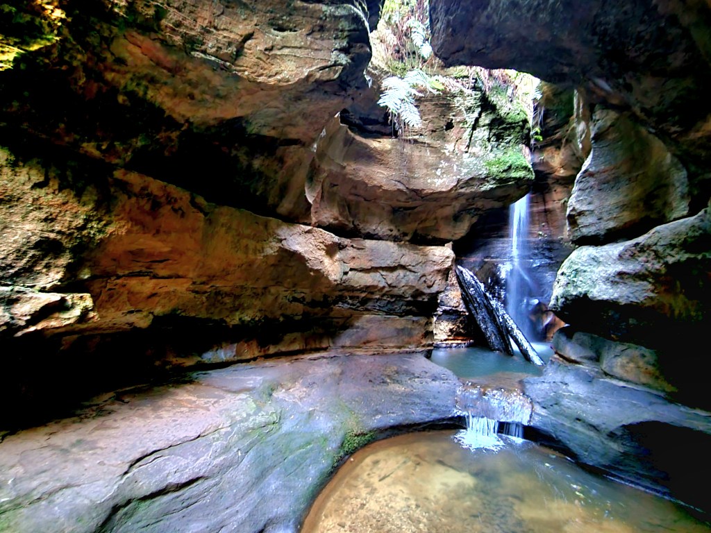 Up you go to an intersection where a short diversion takes you into a small canyon, aptly titled The Grotto, featuring a low overhang with a picturesque waterfall and pool, a favourite for locals in summer. Then it’s back on trail and heading upwards to Centennial Glen, replete with old growth eucalypts standing tall, memorable overhangs with lush fern clusters, a walk behind a couple of waterfalls and the echoing sound of those climbers/abseilers.