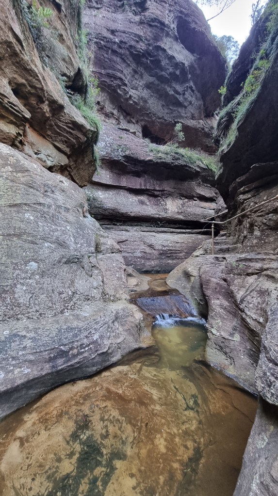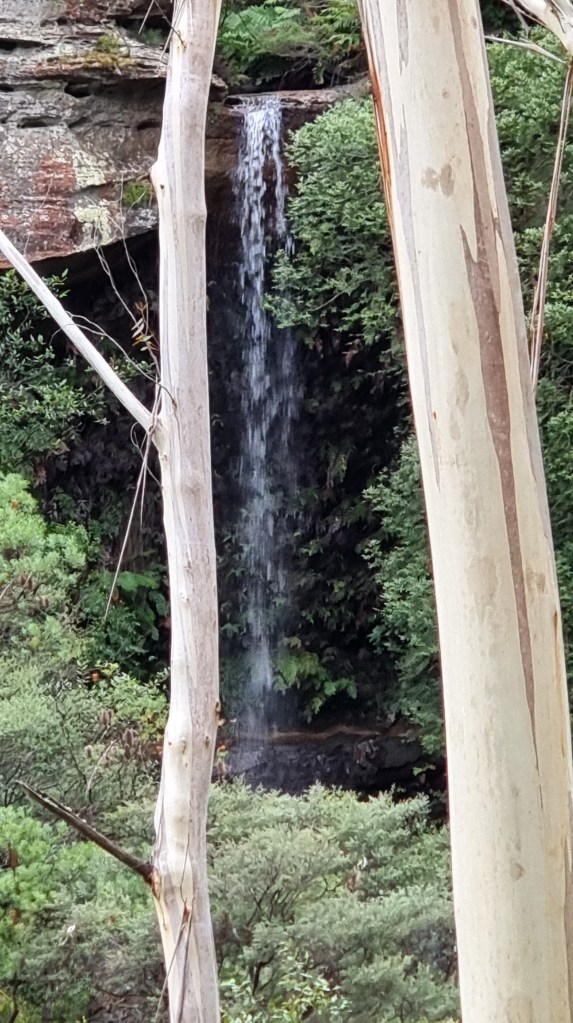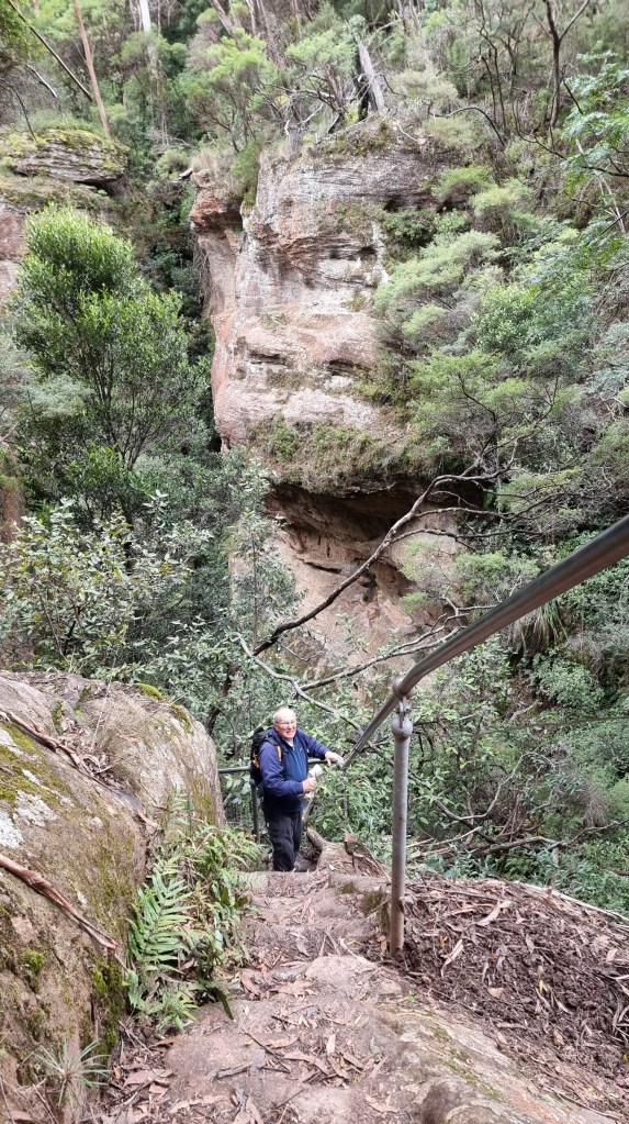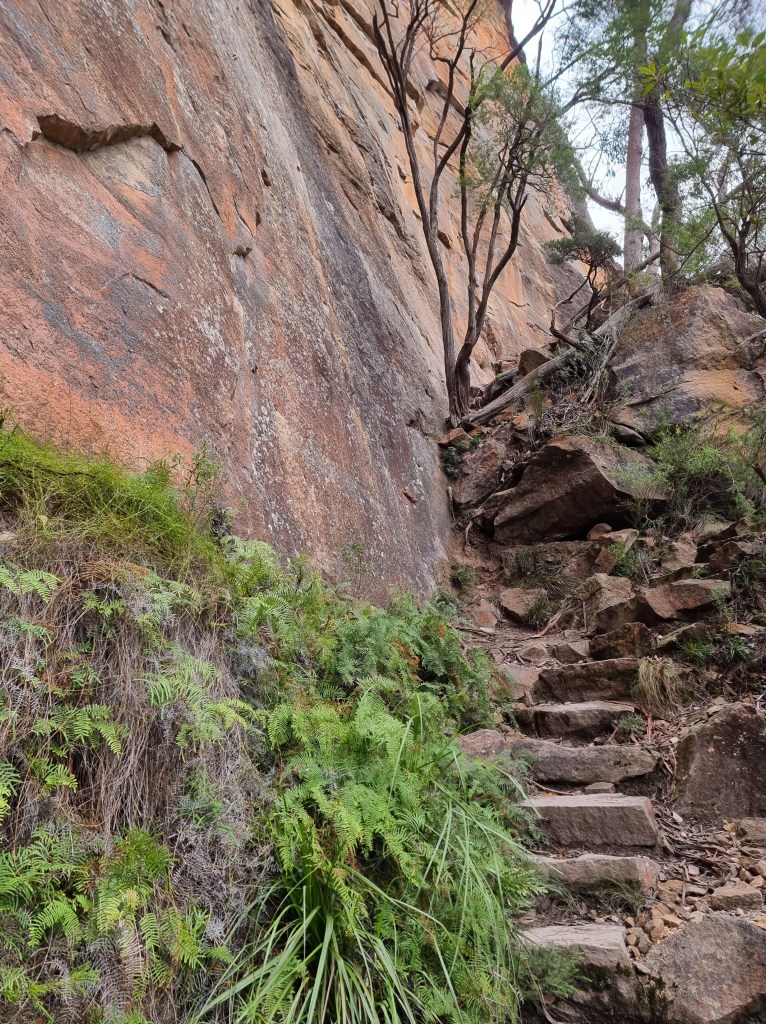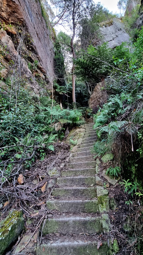 One of the most dramatic bits of walking in the whole Blue Mountains, you have to rock hop a stream, find a way through large moss-covered boulders and then mercifully grab a hand rail to launch yourself upwards on the narrowest of staircases cut into the rock face with the slimy brown cascade beside you. Those with vertiginous problems need not apply!