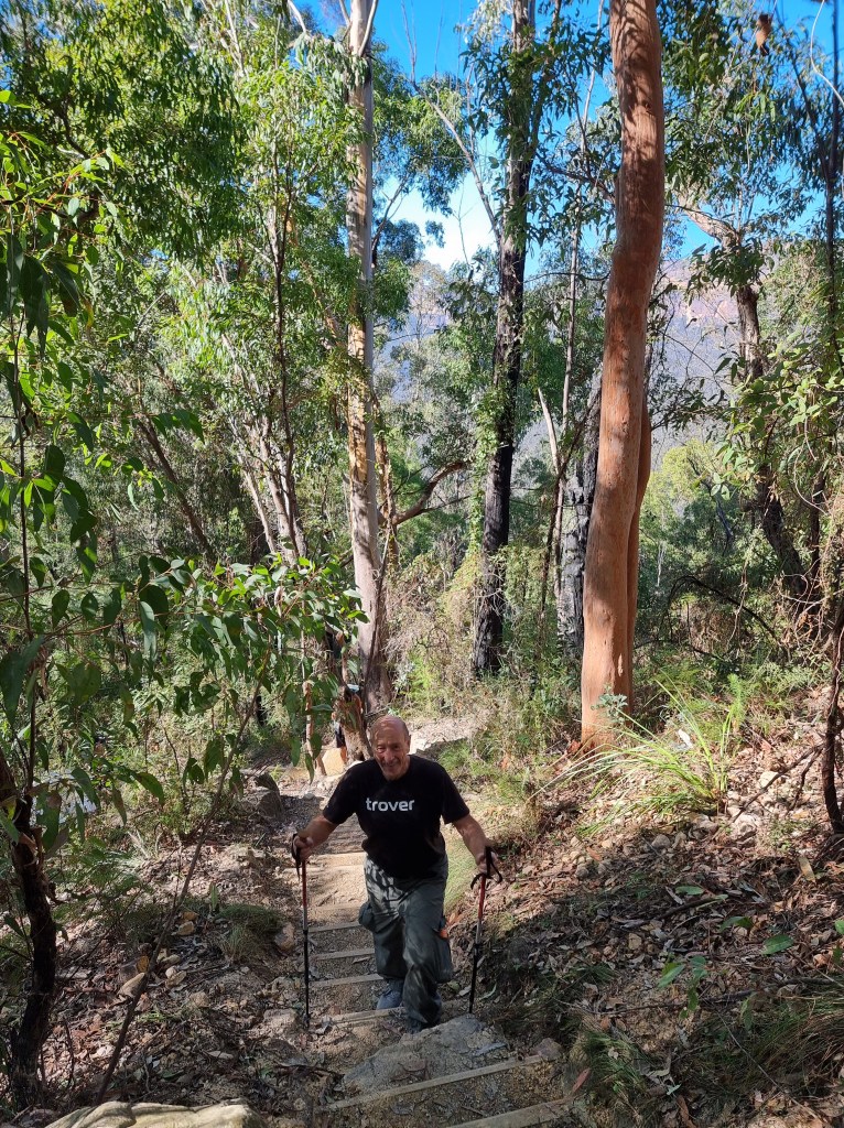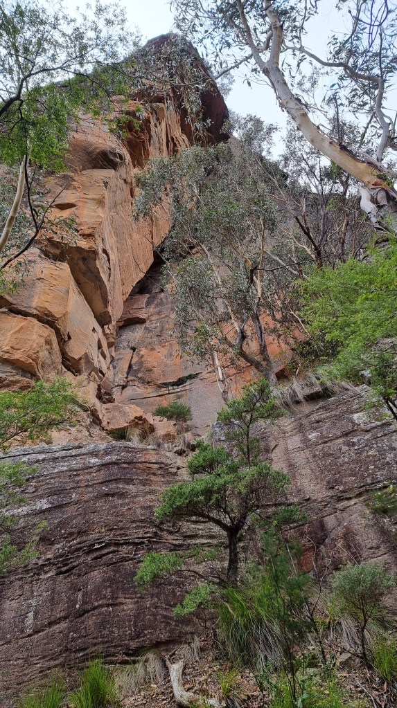 Now it’s back up the steep stairs, pausing here and there before I reach the intersection that will take me to Centennial Glen. Heading left takes you to a utopian canyon with towering walls much favoured by rock climbers (there are fixed pitons everywhere). In the middle is a glorious forest of pencil straight ribbon gums and, in a couple of places, water cascades from unseen streams at the cliff top. All the way to the curved, overhanging sandstone ledges that shelter prolific fern growth. As a place to bushwalk, it is without peer.