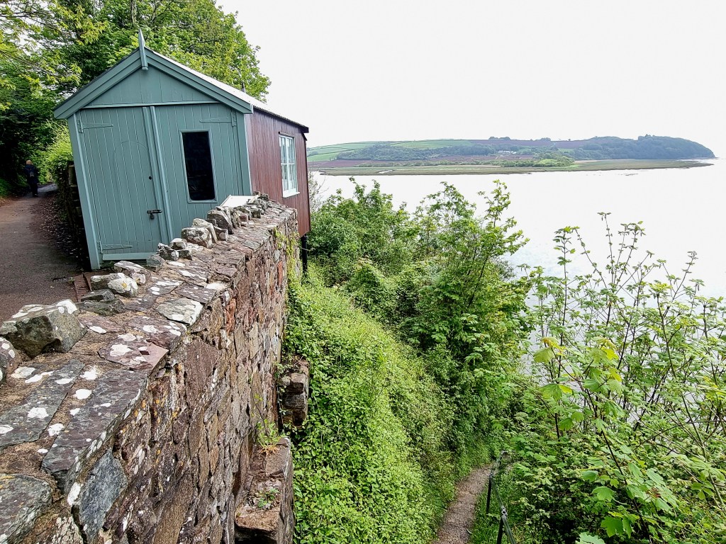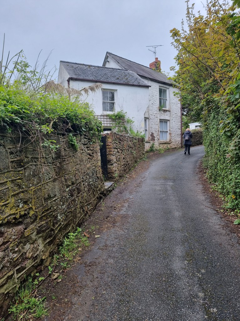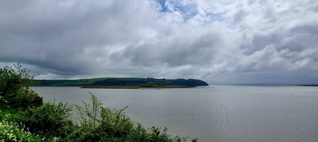Flanked by vines, shrubbery, the occasional tree with the lush green sea grass of the tidal flats of Carmarthen Bay behind, it stands stark against the sombre background of indecisive clouds. Will it rain or nay? That is the ever present question for viewers of this area.