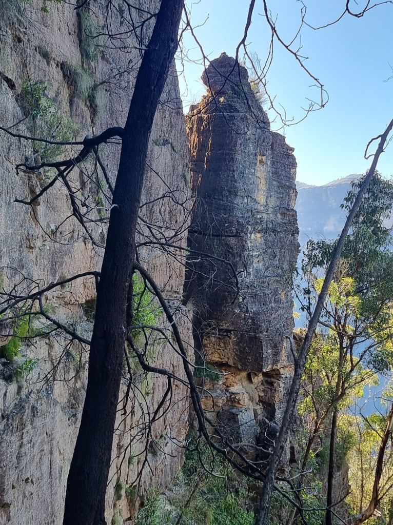Yet this walk is one of the most scenic and has more variety than any other I can think of in the whole Blue Mountains. Many internet sites rate it THE top walk. There’s waterfalls, giant cliffs, panoramic views, canyons, ragged rocky outcrops covered in colourful lichen and a variety of flora and fauna. It’s also a mecca for rock climbers, whose grunts and efforts echo eerily across canyon walls. They’re so prolific they even have pitons permanently fastened on many of the rock faces.