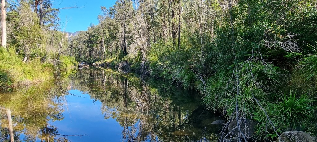 I’m aiming for a large stand of Eucalyptus deanei trees on the junction of the Grose River and Govetts Creek and I finally reach a T-intersection where I can turn 600 metres to the Acacia Camp Ground, a popular haunt for overnighters. At around 200 metres there’s a side trail. It leads to the river which can clearly be heard.