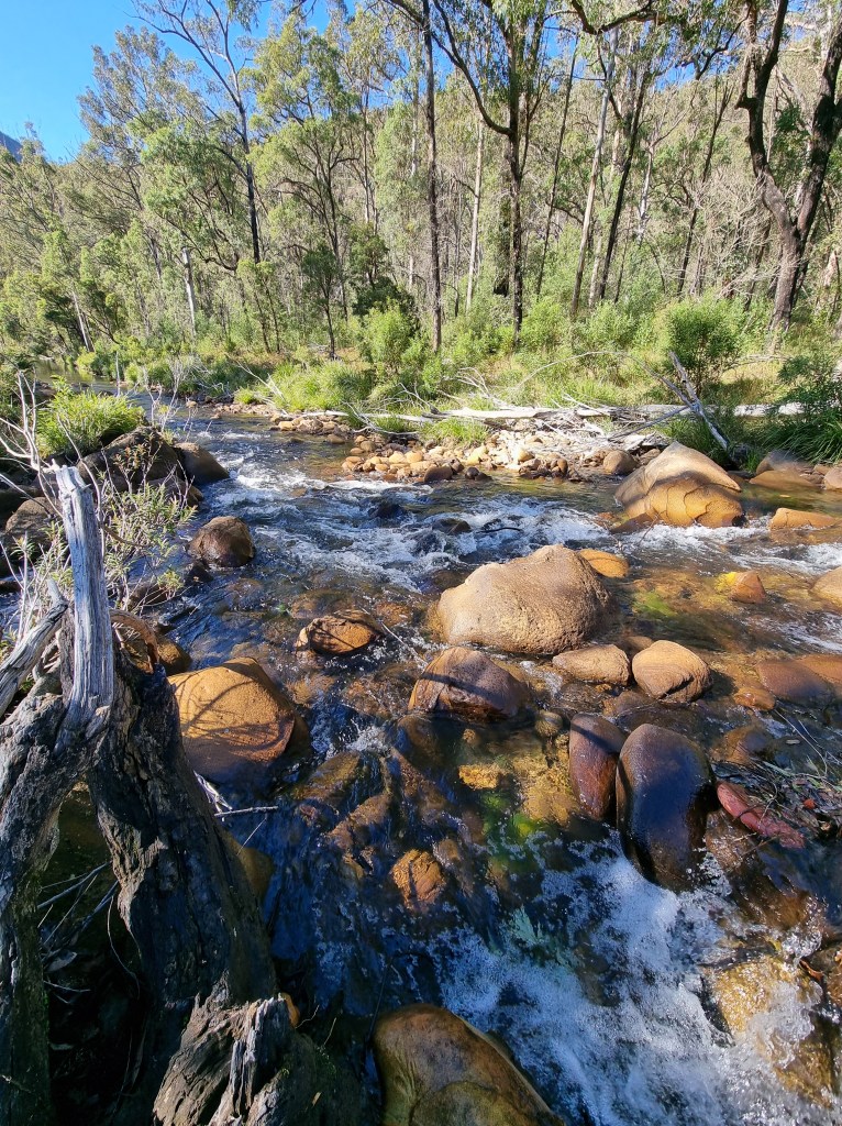 Strange rock shapes and cliffs with colourful lichens now become a feature and the bent and twisted white gums at the top become wondrous tall and straight ribbon gums where the winds are absent.