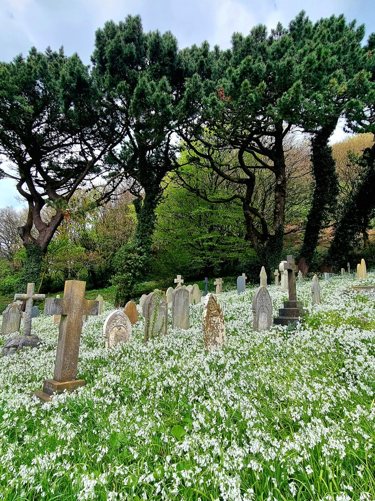 We head for the railway again, this time it’s packed both ways and, at the top, we seek directions off the driver to the Valley of Rocks. 15 minutes one way and 40 the other with a 45 degree slope we’re advised. With our aching legs it’s a no brainer so we set off down one of the main roads of Lynton but pause for a cemetery that’s awash, not only with old gravestones, but thousands of white bluebells. We’re later advised that is was mainly a special burial place for nuns.