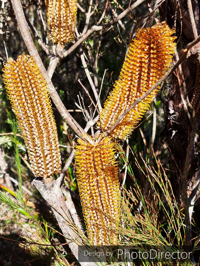 It was decidedly unpleasant riding the bike to the trailhead, a firm grip on the bars was de rigueur while being buffeted. For once I was glad to get off and start walking, this time from Centennial Glen carpark. Though a little exposed there was enough vegetation and the banksias were prolific. Fern leaved, Heath leaved and Hairpin were three that I recognised but, the gum trees have over 100 varieties up here, so only experts need apply for that identification.