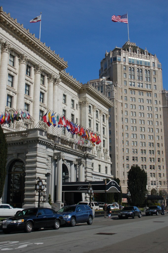 Today’s magnates can be found at the Pacific Union Club, an exclusive building that  reeks of security and survived the 1906 quake and fire that turned nearby wooden buildings into charcoal.  The first building that captured my eye was the 606 room Fairmont, across Mason Street from the P-U and flying all manner of flags, occupying the block James G. Fair left to his children. The standout building featuring elegant porte-cochere and spacious lobby opened in 1907, the tower in 1961. The Penthouse Suite — rooftop manor, really — will set you back just under $20,000…..per day of course, though butler, maid and limousine service are included.  The corner it dominates at California and Taylor was first graced by wealthy 49-er Richard Tobin’s Victorian manse. The 12-story building housed apartment dwellers from 1924 to 1945 when it was converted into a hotel.