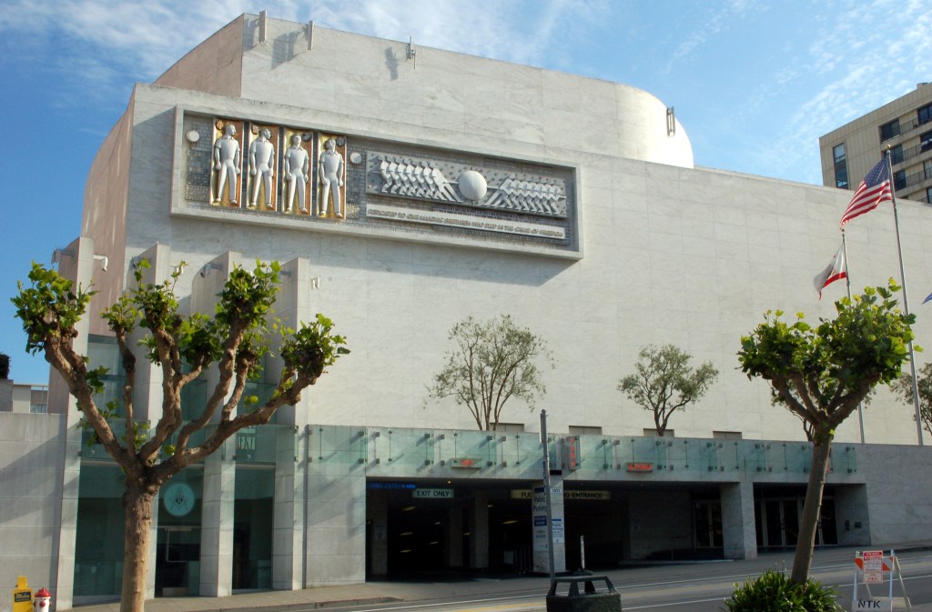 In total contrast nearby is the SF Masonic Auditorium (1958).  On the main (north) façade, there is a large frieze by Emile Norman bearing the inscription “Dedicated to our Masonic Brethren who died in the cause of freedom“, depicting stylized servicemen from each of the four branches of the Armed Services, and a global tug of war representing global struggles.
