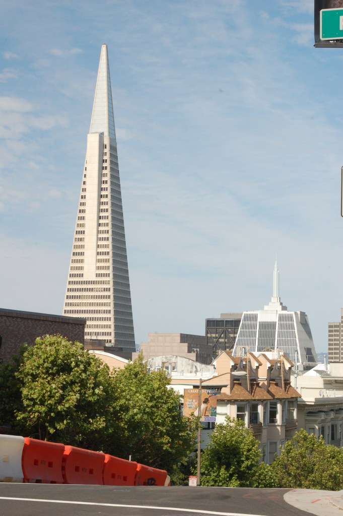 It rumbled out, all ten tons of it, relying on a clamp.  How fast you go depends on how hard the gripman grasps, though 9.5 m.p.h. is the maximum.  Just how steep the streets are becomes quickly apparent as we ascend, a serious 24.8 percent in one spot.  I reflect on architecture as we mount and there is plenty of variety on show.  Somewhere in the distance the Transamerica Pyramid looms, its weird sharp pointed shape dominating the skyline.