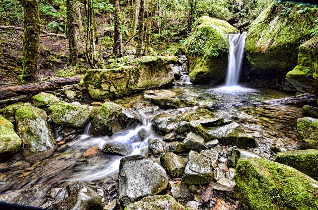 Then I was on my way, having opted to do the Thirty Foot Pool and the Twin Falls.  The secondary growth Douglas Fir and Western Red Cedars have excluded much light from the forest floor, leaving moss laden remnants and a fungus or two.  It exuded an almost eerie calm as I barely managed a stroll, wallowing in the serene delights of an almost mature woodland.