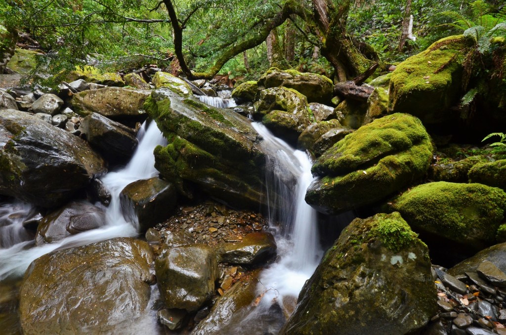 You immediately become surrounded by Myrtle, King Billy Pine and Sassafras that dominate the temperate rainforest of this region and, as you move into the bush proper, leaving behind the forestry practices of the past that have regenerated as scrubby eucalypt, it’s time to meet the Tasmania of Gondwana times and walk between the carpets of sphagnum moss that lie thick among the rocks.  Elsewhere ferns survive where they can, mostly beside the streams where they can catch flickering glimpses of the sun at certain times of the day.