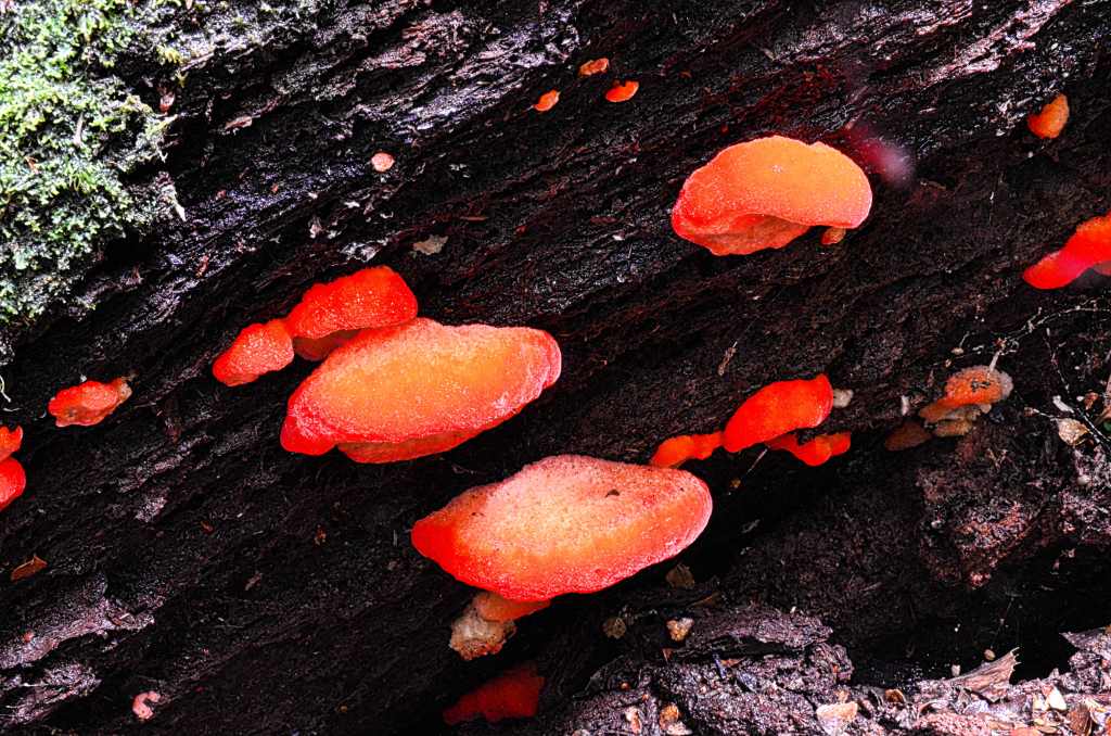 I can barely find it credible that the track diverts, moves away from the river, and gets even steeper.  Surely we must close?  No, but we are about 2/3rds of the way and the forest is eye candy all the way along the route, supplemented by colourful fungi that we find irresistible.
