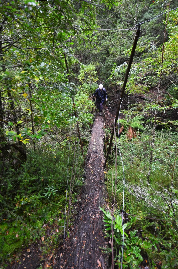 Almost suddenly, after being so focused on gaining a sure footing, we’re there.  Gerry points to something down below and I’m off, only to discover it’s a large log, resting across a gorge, sorry chasm, hence the name.  If acrophobia is part of your make up, you won’t be walking across this span over a vertiginous cleft continually being eroded by nature.  On either side of the log is chicken wire attached to a single strand of fixed wire.  That’s all that separates you from death.  It must be said however, that the log’s surface is pretty flat and I found walking across it easy, unlike poor acrophobic Gerry who, having made it across, wouldn’t go back but chose the option of crossing the stream above the falls.  Unlucky Gerry, there was too much water coming down so he was forced to return and negotiate the log once more.  That was after we’d consumed lunch, my choice being a gourmet roll I’d purchased earlier in the day and kept boasting about all the time I ate it, while Gerry was stuck with his home-made sandwich.