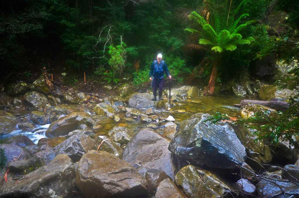 Gerry’s missing jumper came into view and I pointed it out, rather than pick up the sodden woollen garment, before we reached the old abandoned carpark and walked downhill to the crossing, then rock hopped to the other side before climbing back to the car.  Blessed relief, a chance to sit, maybe dry just a little, check ourselves for beasties and head back to civilization.  I’d divested myself of back pack and camera and was safely ensconced in the passenger’s seat with Gerry still outside at the boot when the heavens opened up.  As if he wasn’t wet enough already!  While I would probably have dived in the car until it eased, Gerry, in true Taswegian style, toughed it out and got on with unburdening.  Eventually his saturated clothes and body entered the vehicle and we headed off, heater at the full.