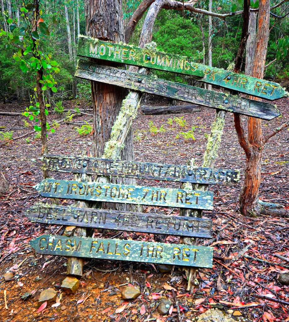 Arriving at the carpark, so called, I’m surprised to learn that there used to be a bridge across the Mother Cummings Rivulet (nee Smoko Creek) and that you used to drive across.  Now, there is no bridge and you’re forced to go down through the scrub and cross the stream before picking up the old road again until you reach an intersection where there used to be a carpark and here you turn left on the Ironstone Mountain Track for a purported 1 hour return trudge to Chasm Falls and back.  The sign has fallen and is resting on some trees, resplendent with its coat of Spanish Moss and lichen that make it barely legible.  Other tempting destinations such as Smoko Falls and Bell Tarn are also listed.