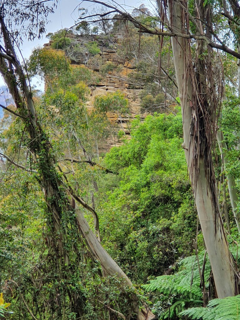 Still, the track was listed as one rarely used and I was sure I’d seen stuff I’d never walked past before.  Then again, when you’re leaping fences (not in a single bound these days), dangling over off-piste vertiginous drops and scrunching around in virgin forest, you’re bound to come up with things like angles of Katoomba Falls I’d not taken previously.  The Rough Tree, Soft Tree, King and Fishbone Water Ferns were all flourishing with the recent rains and gathered in great clusters beneath the towering ribbon gums and other assorted natives.